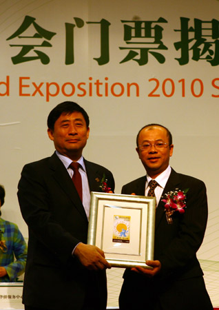 上海世博会事务协调局局长洪浩向“华侨华人回家看世博”组委会负责人赠送上海世博会定制票样张。