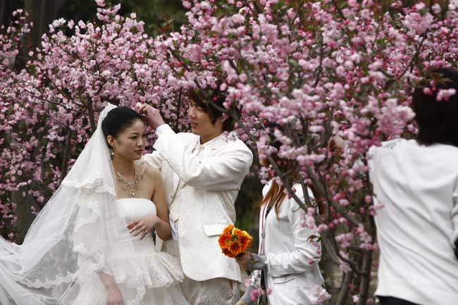 3月30日,一对准新人正在上海植物园的桃林中拍摄婚纱照。