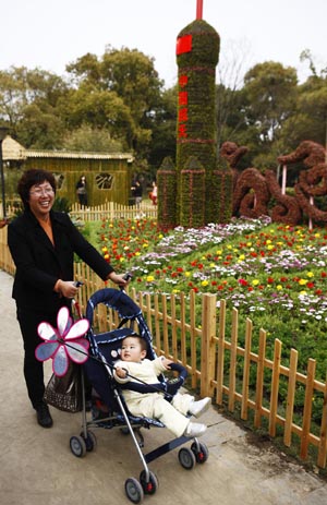3月30日,市民从长征运载火箭的园艺造型旁经过。