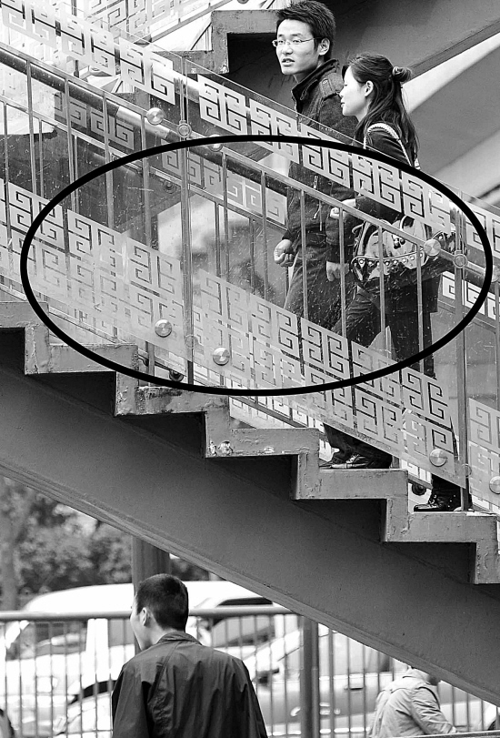 昨天,本报特意派了一位女记者赶到汽车东站旁的人行天桥。果然,天桥上所有上下电梯和台阶两侧都装满了玻璃。