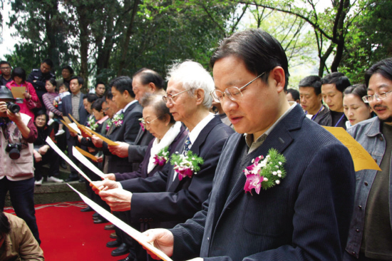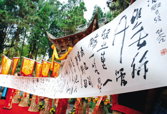 春日迟迟,群贤毕至,书圣故里再举盛会。昨日上午十点,第六届中国嵊州国际书法朝圣节在王羲之墓前隆重举行朝圣仪式。 中国书法家协会名誉主席沈鹏,中国国家画院沈鹏书法精英班的书法家,山东省书法家协会副主席、临沂市书法家协会主席龙岩,浙江省书法家协会顾问、绍兴市书法家协会主席袁长寿, 书圣后裔、浙江省书协理事、中国硬笔书法家协会主席王正良,40集电视剧《书圣王羲之》主创人员,以及我市领导郭敏、盛秋平、朱钦苗、王生灿、何国英、夏春燕出席了朝圣仪式。 昨日,第六届中国嵊州国际书法朝圣节还在金庭观举行笔会。来自国内外众多知名书法家在书圣故里挥毫创作,以笔会友。市领导盛秋平、夏春燕、周晓东等参加了金庭笔会。市委常委、宣传部长何国英主持笔会。