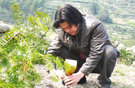 香榧树,摇钱树。通源乡松明培村民靠香榧致富,人均拥有老榧树3棵,近年,他们又大量培植新榧树。阳春三月,正是榧树嫁接的黄金时节,大多数榧农忙碌在山上,为他们的“摇钱树”小心嫁接。图为村民邢黎明正在嫁接5年龄的香榧幼苗。