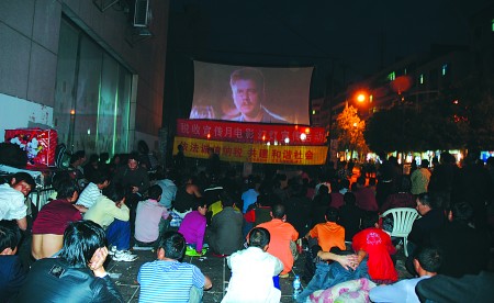11日晚上,义乌粥摊处,大量外来人员在看免费电影。
