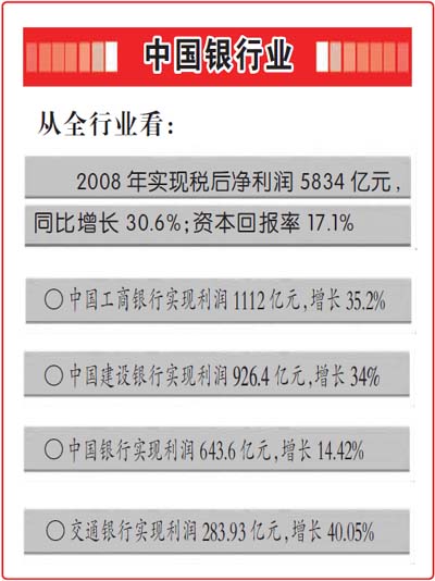 从全行业看,2008年,中国银行业实现税后净利润5834亿元,同比增长30.6%;资本回报率17.1%,预计比全球银行业平均水平高7个百分点以上;全行业利润总额、利润增长和资本回报率等指标名列全球第一。