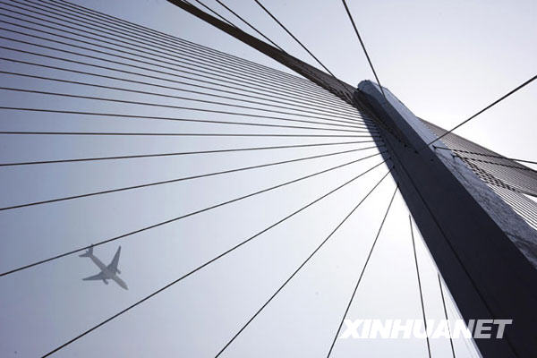 4月15日,一架飞机从上海长江大桥212米高的主塔上空飞过。新华社记者 裴鑫摄