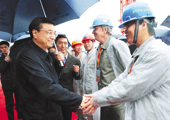 在施工现场,李克强与工程一线建设者亲切交谈。他嘱咐说,三门核电站是我国首个第三代核电自主化依托项目。建设这一工程,责任重大,使命光荣。要始终坚持安全第一、质量第一,不断总结经验,培养人才,加强成本核算和资金监管,努力建成一流工程。