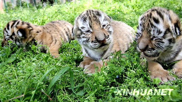 4月29日,三只东北虎幼崽在户外享受春光。
