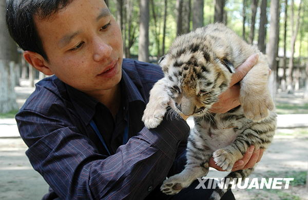 4月29日,动物园工作人员展示一只东北虎幼崽。新华社发