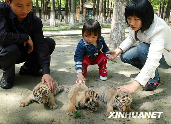 当天,江苏省昆山市动物园内三只刚出生9天的东北虎幼崽首次来到户外,享受春光。在工作人员的精心照料下,这三只虎崽健康状况良好,“五一”期间将正式与市民见面。新华社发(濮建明 摄)