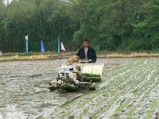 崇仁镇大力推广工厂化育秧和机械化插秧的粮食生产机械化,目前,该镇已有7个育秧工厂,拥有8条播种流水线,15万只秧盘,28台插秧机,育供秧和插秧全部实现了商品化。今年,全镇计划实现机插面积1.5万亩,其中早稻5000亩。图为市仁山粮食生产全程机械化专业合作社在进行早稻机械化插秧。