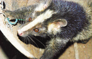 果子狸也叫花面狸、白鼻狗、花面棕榈猫等,系灵猫科果子狸属,是国家二级保护野生动物。果子狸属夜行性动物,具有昼伏夜出的习性,其食性杂,喜欢果实和谷物,亦食各种小鸟、鸟卵、小型爬行动物、鼠类、昆虫等,在遇到敌害时,能从臭腺射出浅黄色分泌物自卫,但在平时无奇臭味。