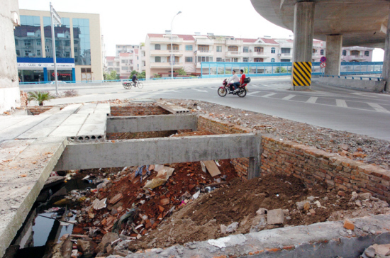 双塔大桥西侧相公殿北路旁有个拆迁后留下的地下室,现裸露在路边,成为一个大坑,严重危及行人的安全。这里还容易积起污水,成为卫生死角。