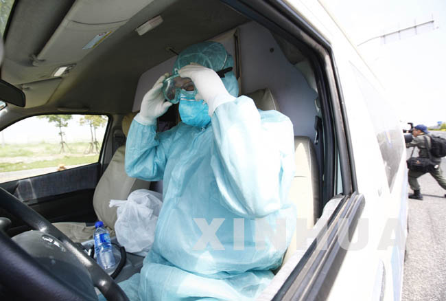 5月5日,一位卫生防疫人员正在转运前检查个人防护装备。