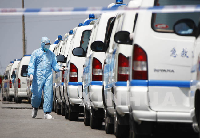 5月5日,一位卫生防疫人员从28辆急救车组成的转运车队旁经过。