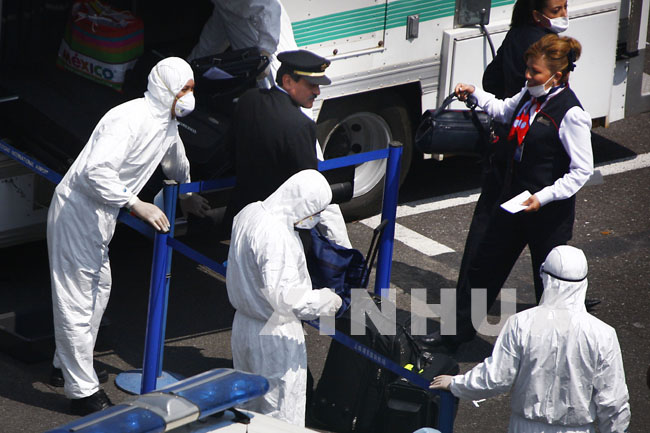 5月5日,墨航AM098次航班的机组人员正在登机前接受检验检疫。
