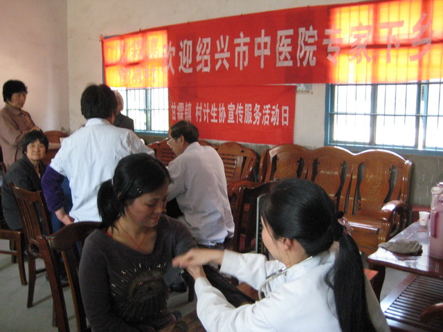 甘霖镇殿前村计生协会活动室里人头攒动,原来是绍兴市中医院的专家组来殿前村开展送医下乡义诊活动.这次义诊活动一共邀请了7名绍兴市中医院的高级医师来诊,其中有2名是高级专家,3名是副高级专家,包括眼科,中内科,西内科,骨科还有B超等医疗门类.活动受到了村民的热烈欢迎,看病的队伍一直排的满满的.同行的还有镇计生办的几位同志,她们带来了许多关于计划生育,优生优育的资料和宣传手册.活动从上午9点一直进行到下午1点30分,许多来不及看病的村民都强烈希望专家们能够再次来村里开展此类活动。