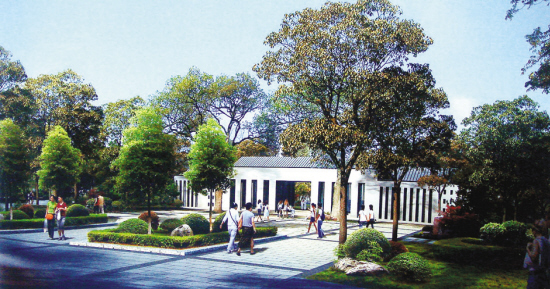 湿地公园整个景观以水系为轴,结合地形和周边环境,分成湿地景观区、商业休闲景观区和教育文化景观区三个大区块。从西面的主入园口进入,由门楼、耳房和厢房等组成的建筑群,用于餐饮、咖啡茶座等,沿着曲折的水面,往南,有次入口,是用以休闲娱乐的服务性建筑。江堤在改造中充分利用现有挡土墙,设置浮雕,江中有小岛,结合绿化形成完整的自然景观,沿江堤建有亲水木栈道,让市民在移步换景中,体验文化,亲近自然。