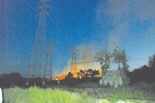 村民茶园烧荒 险烧高压电线