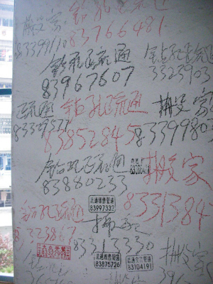 家住崇安里的王女士最近向记者反映,她所居住的楼梯及墙壁上,触目的斑驳:办证刻章、搬家、疏通以及电话号码等油漆字凌乱地密布在白色的墙体上,有的地方尽管已被白色涂料粉刷过,但“牛皮癣”留下的阴影仍刺激人的眼球。