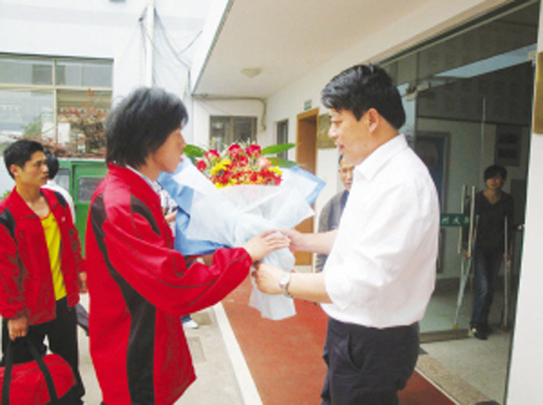 昨日,绍兴市首届残疾人运动会圆满闭幕。由34名残疾人组成的我市代表团共获得了金牌29块、银牌14块、铜牌6块,聋人篮球队获得第三名,代表团以总分193分的好成绩名列团体第二,同时我市残联还被绍兴市首届残运会组委会授予“优秀组织奖”。图为市残联负责人给载誉归来的残疾健儿送上鲜花以示祝贺。