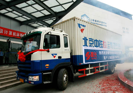 新华网上海频道5月15日报道:5月15日清晨,运载着中国首台国产百万亿次超级计算机“魔方”的车队行驶在上海的公路上。当天运抵上海超级计算中心的这台“魔方”是去年9月在天津成功下线,于14日凌晨由北京启运至上海。预计在上海超级计算中心完成安装调试后,魔方将于6月份开放。这标志着翘首等待多日的3百多个承担着国家和地方重大工程、科学研究和新产品研发的用户单位和上千名科研人员即将能用上世界一流的严打利器。在最近一次公布的全球超级计算机TOP500强排行榜中,“魔方”以峰值速度230万亿次、Linpack性能测试值180亿万次的成绩,跻身于世界超级计算机第十、亚洲第一的行列。新华社记者 任珑摄影报道