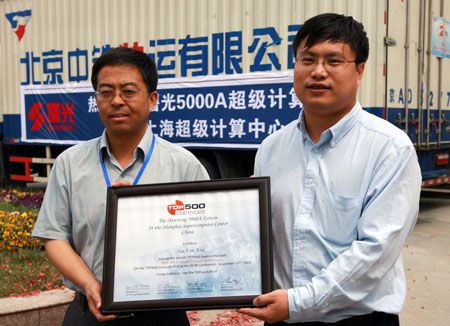 上海超级计算中心副主任李根国博士(左)和中国曙光信息产业有限公司副总裁聂华在展示“魔方”的“亚洲第一”认定证书。