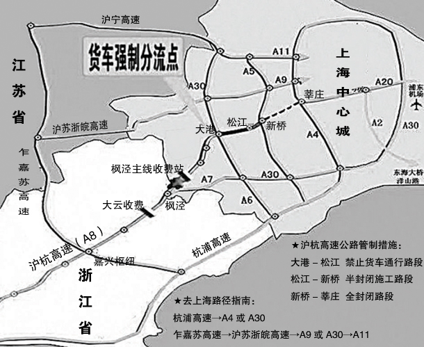 在施工期间,有些路段全天禁止货车通行:A8沪杭高速公路(A30大港立交—新桥立交)入城方向全天禁止货车通行,A20转A9北向西、南向西(往湖州方向)匝道全天禁止货车通行。