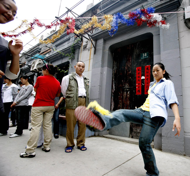 生活在上海一石库门里弄的女孩在踢毽子(5月17日摄)。