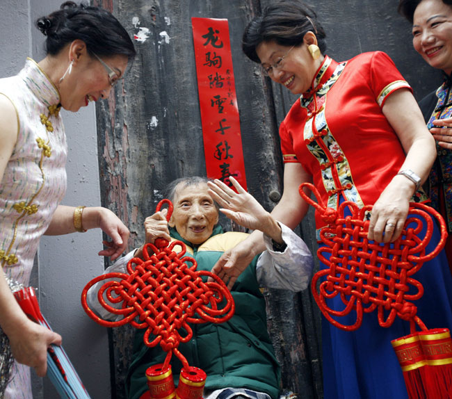 上海一石库门里弄内的95岁老人接受邻居祝福(5月17日摄)。