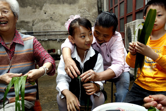 上海一石库门里弄内的几代人一起包粽子(5月17日摄)。