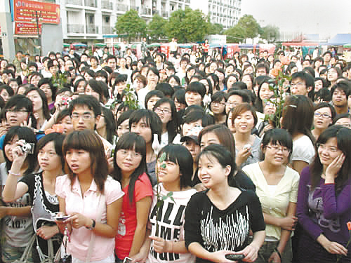 昨天下午,这个特殊的庆生派对在宁波一所高校北区宿舍商业区的中心广场上举行。下午4点,光鲜的舞台早已搭好,舞台上拉着巨幅的喷绘背景,还有乐队演奏着欢快的乐曲。