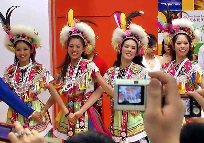 台湾展区身穿具有民族风情服装的居民吸引观众拍照。