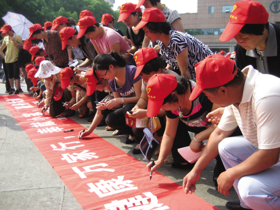 5月22日上午,市委政法委、市妇联和鹿山街道举行了“平安健康万家行”宣传服务月活动暨鹿山街道家庭志愿服务队成立启动仪式,这次活动的主题为“平安健康你我他,文明和谐进万家”,刚成立的鹿山街道志愿者服务队为群众进行现场咨询服务,并分发平安健康知识等资料。图为志愿者服务队进行签名的场景。