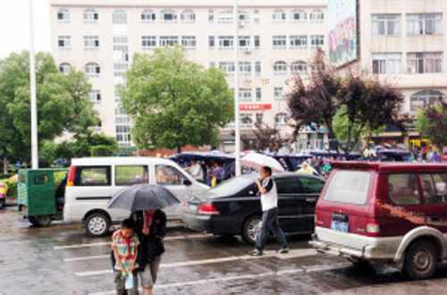 国商大厦门口,车辆川流不息。突然,前面一辆出租车猛地一个急刹车停了下来,原来是从商场内出来一个顾客,挥手“打的”。后面紧跟着的车辆差点撞了上去。