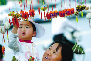 端午节小孩佩香囊,传说有避邪驱瘟之意,实际是用于襟头点缀装饰。香囊内有朱砂、雄黄、香药,外包以丝布,清香四溢,再以五色丝线弦扣成索,作各种不同形状,结成一串,形形色色,玲珑可爱。