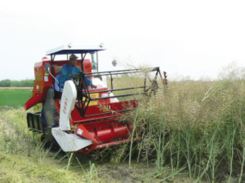 在技术人员指导下,种粮大户沈仁山操作多功能收割机开进自家油菜田(如图)。在收割歇息过程中,沈仁山告诉记者,以机械代替手工,这真是油菜收割的一大飞跃,明年他准备把油菜种植面积从今年18亩增加到60多亩。