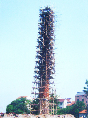 近日,地处经济开发委谢慕村边50多米高的砖瓦厂烟囱,已由三江拆房有限公司人工安全拆除。据该公司负责人马伯根介绍,这么高的建筑物用人工拆除在我市尚属首例。据了解,谢慕砖瓦厂这支50多米高的烟囱,如果采用定点爆破拆除,不仅省时、省力而且又省钱,但因为距村民的住房太近,为了保护村民的财产和人身安全,谢慕村委托三江拆房有限公司进行了人工拆除。图为三江拆房公司的工人们在烟囱周围搭起架子,在一锤一锤地进行拆卸。