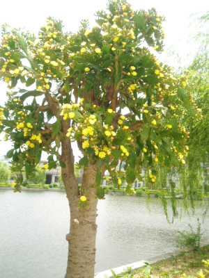 近日,记者在天乐集团看到一棵罕见的树木。此树直径达30公分,树上千朵万朵金黄色的花正开得闹闹猛猛。据天乐集团董事长葛南尧介绍,这棵“仙人树”去年开花3600朵左右,今年大概有4000来朵,花期从4月份将一直持续到10月份。