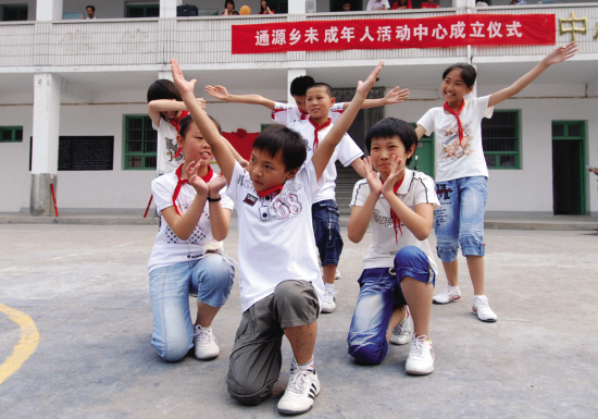 图为通源乡未成年人活动中心成立仪式上小学生们正在表演节目。