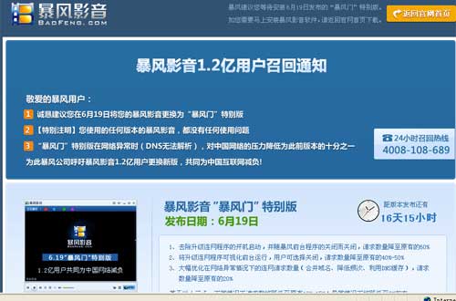 新华网北京6月1日电(记者张舵)因“5·19”断网事件成为焦点的暴风公司1日宣布,将为市面上所有1.2亿暴风影音用户更新播放软件,以消除断网事件中暴露的网络隐患。这是中国首例软件召回事件。