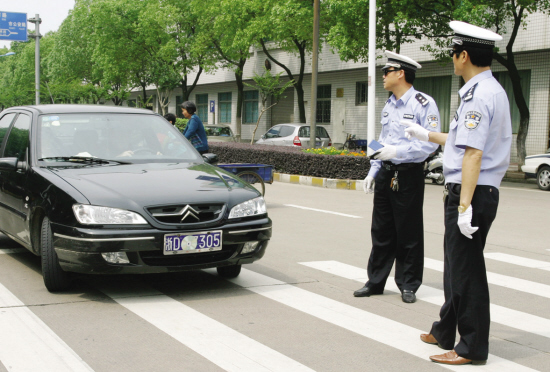 图为官河路上一辆车牌上贴着光盘的小车被交警查获,交警对车主进行了教育与处罚。