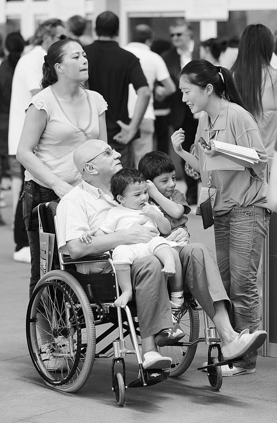 坐在轮椅上的哥伦比亚客商阿尔加多,带着全家人赶到浙洽会现场采购日用消费品。 本报记者 董旭明 摄