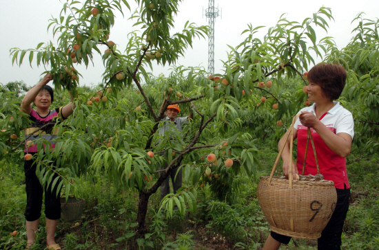 日前,崇仁镇裘岩村的桃子上市了。水果是裘岩村的主要经济作物,该村水果总面积200多亩,几乎家家户户都种植着红李、桃子、梨等各式水果,水果销售收入达70万元。图为村民在桃园里高兴地采摘。