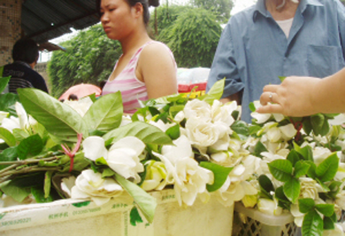 家住附近的张小姐买了一束,她说,一元钱一束,太便宜了,自己去玉堤上摘,还找不到花呢,还不如买一束来得省事。她说,她已连着买了好几束,自家的屋子都被栀子花香洇染了。