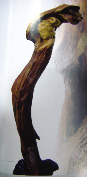他心里有所触动。便向朋友要了这块木头,然后回到自己位于艺术村的小作坊——那时,他在宓风光等人的帮助下,已经开始接触根雕领域。在狭窄的小作坊里,他将这块古沉木放在案头上,一边思量,一边寻找资料,以获取灵感。