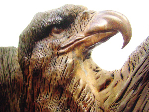 木头放了两个月,他琢磨了两个月。一次,他俯下身子去拿放在桌子底下的一把凿子,一抬头,猛地觉得一只鹰正扬着头,欲展开翅膀猛冲下来。他一下子觉得热血沸腾。立起身后,马上把这块古沉木摆在面前,拿着凿子敲打起来。