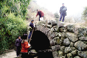 第三次全国文物普查工作人员在崇仁镇富安村雅岭自然村接龙桥考查。