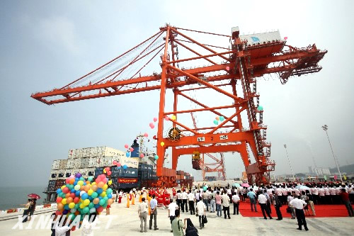6月16日拍摄的台州港大麦屿港区对台湾基隆港集装箱运输首航仪式。(王天荣 摄)