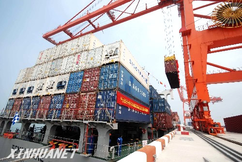 昨天上午9时45分,玉环县大麦屿港5万吨级多用途码头上,集装箱被缓缓地吊装上台湾“中外运基隆”号货轮。此举标志着台州和台湾实现了海上直航。
