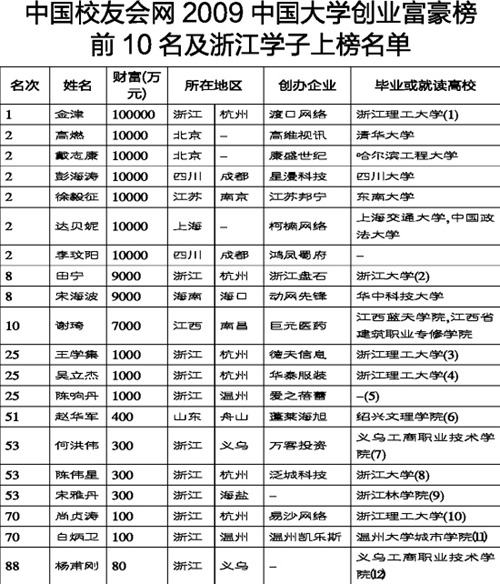 6月24日,网络上出现一张“2009中国大学创业富豪榜”,其中“第一首富”竟出自浙江——是网游新锐杭州渡口网络的金津,毕业于浙江理工大学。榜单里还有郭敬明,排行15,“财富”为3500万元。
